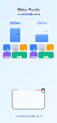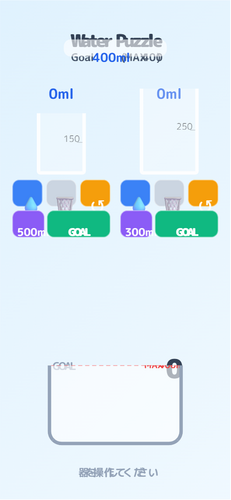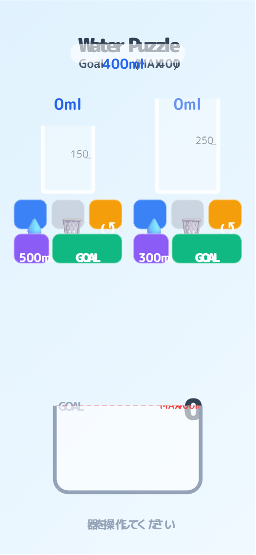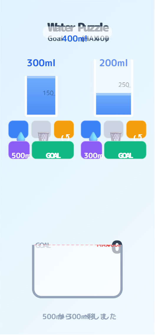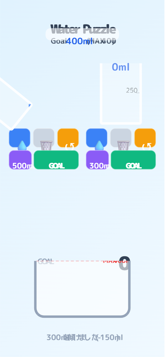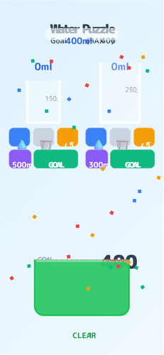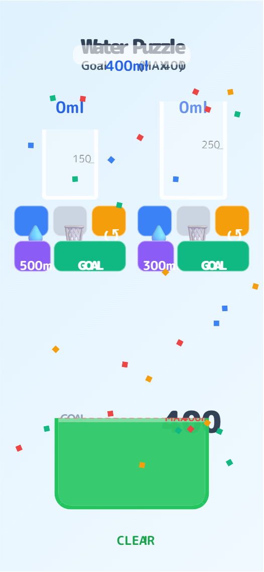 The goal is to fill the target container with exactly 400ml of water. If the water in the target container exceeds 400ml, it will overflow, and it's Game Over.
